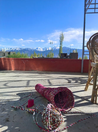 Totemic Shifts emerged from two months of laborious stitching and knotting, created partly in Mumbai and completed in Leh. I often worked alone, but others sometimes contributed, turning the creation process into a communal action. Thank you to everyone who helped with this project.